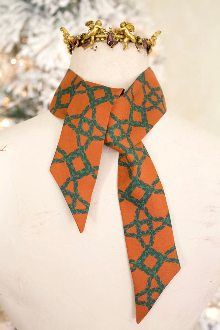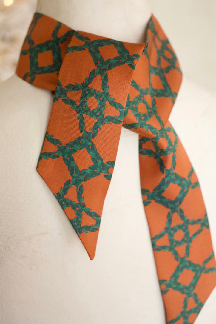 Crafted in luminous 100% silk twill, the Isla twilly is a piece lovingly designed to be cherished. Its palette of burnished amber and deep evergreen forms an intricate, wreath-like motif reminiscent of latticed gardens and sun-warmed hideaways. The pattern feels at once intimate and architectural, like a secret place only you know.